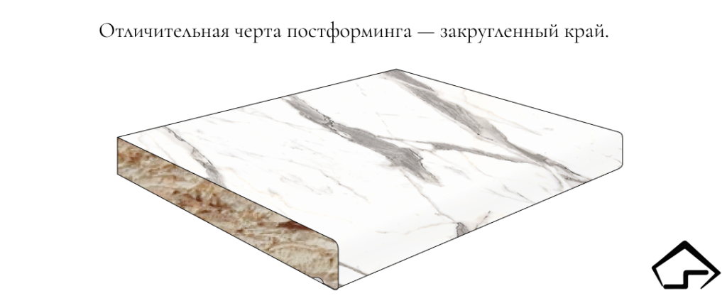 Для облицовки пластиком основы, он подлежит нагреванию с последующим огибанием поверхности ДСП. Таким образом, отличительной чертой поверхности столешницы постформинг является скругленный край. - Защитный слой. Это либо акриловые, либо меламиновые смолы.Данное, завершающее, покрытие придает изделию влаго- и термостойкость, а также защищает от царапин и ударов.