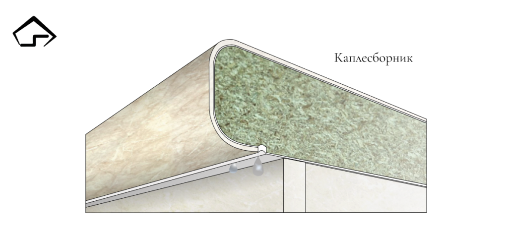 В обоих случаях, на свесах столешницы кухонного гарнитура делается капельник, он же каплесборник. Этот элемент обязателен и несет защитную функцию. При случай утечке жидкости, капли будут стекать непосредственно в капельник и с него на пол. Т.е. влаге не удастся попасть на внутреннюю незащищенную часть столешницы, что продлит ее срок службы.