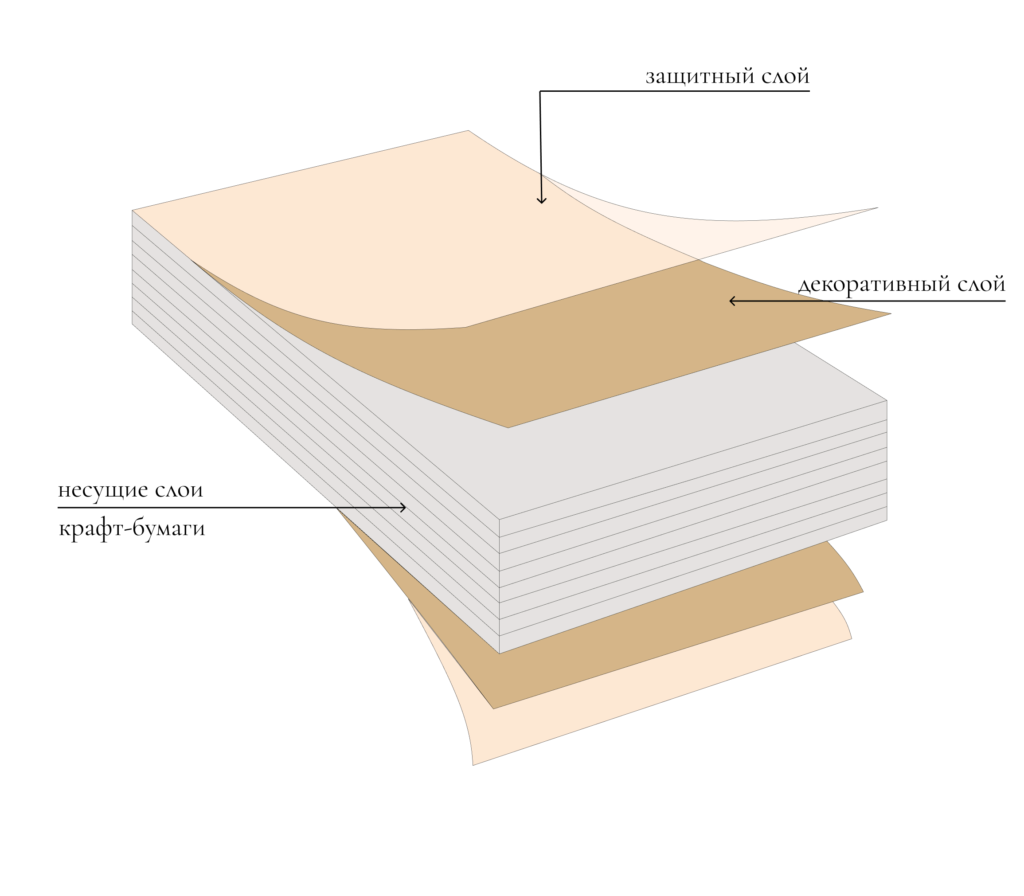 HPL состоит из нескольких слоев, спрессованных под очень высоким давлением. Межде несущими слоями находятся смолы, меняющие под давлением свою структуру, в результате чего образуется твердый сплав — реактопласт. На выходе получается очень плотный, твердый и сохраняющий форму лист; т.е. любые места, где необходимо устойчивое покрытие с выносливостью к длительной эксплуатации.